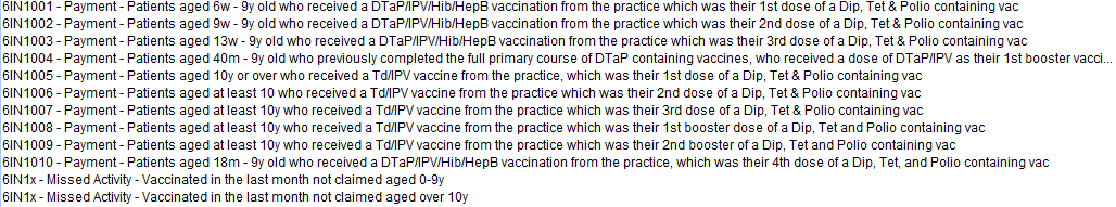 Additional "Missed Activity" searches are provided to highlight additional patients who have not already been counted by the CQRS counts. They are identified by the prefix 6IN1x. Missed Activity searches are NOT built to return a specific service indicator but to capture likely activity based on vaccinations recorded during the month, grouped by a certain characteristic. In the case of 6IN1, this is grouped between under 10s and over 10s.
