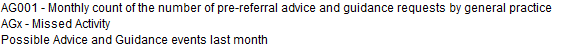 Unlike other CQRS claim indicators, we strongly recommend using a breakdown on the AG001 report rather than picking up the number of patients. The report will show every Choose and book advice and guidance request code from the previous month which may reveal more than 1 unique A&G request. Remember that duplicate coding of the same request should be disregarded.