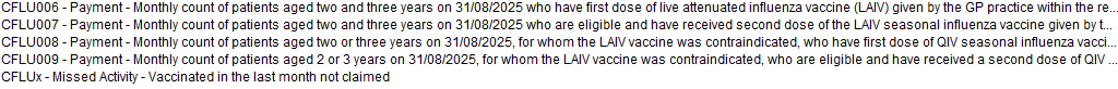 CFLU007 | Monthly count of the number of patients aged two or three years (but not aged less than two years or aged four years or over) on 31 August 2025 who are eligible for a second dose and who have received a second dose of the LAIV seasonal influenza vaccine given by the GP practice within the reporting period. | Born before or on 31st August 2023 | Born on or after 1st September 2021 |
