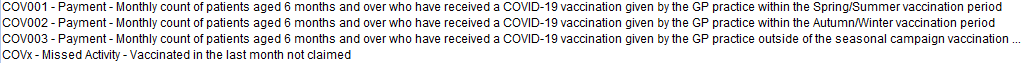 Additional "Missed Activity" searches are provided to highlight additional patients who have not already been counted by the CQRS counts. They are identified by the prefix COVx. Missed Activity searches are NOT built to return a specific service indicator but to capture likely activity based on vaccinations recorded during the month.