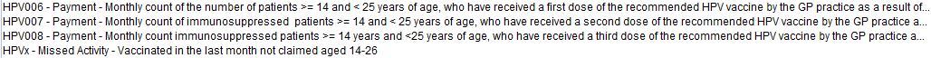 Additional "Missed Activity" searches are provided to highlight additional patients who have not already been counted by the CQRS counts. They are identified by the prefix HPVBx. Missed Activity searches are NOT built to return a specific service indicator but to capture likely activity based on vaccinations recorded during the month, grouped by a certain characteristic. In the case of 6IN1, this is grouped between under 10s and over 10s.