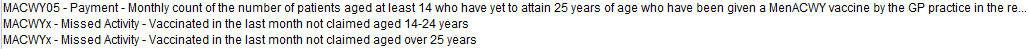 Additional "Missed Activity" searches are provided to highlight additional patients who have not already been counted by the CQRS counts. They are identified by the prefix MACWYx. Missed Activity searches are NOT built to return a specific service indicator but to capture likely activity based on vaccinations recorded during the month, grouped by a certain characteristic. In the case of Men ACWY, this is grouped between 14-24 year olds and over 25s at the time of vaccination.