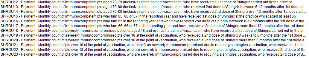 | SHROU016 | Monthly count of the number of registered immunocompetent patients who turn 65 or 66 in the reporting year and who have a record of receiving a second dose of Shingrix between 6 to 12 months after the first dose carried out by the practice within the reporting period whilst aged at least 65. | 65 years 6 months | Born after 01/09/1958 (inclusive) |