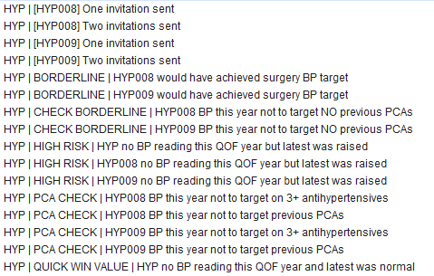 These searches support achievement of the HYP008 and HYP009 indicators, which focus on blood pressure control in patients with hypertension: