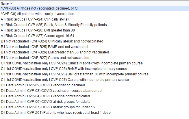 CVP-Q01 contains all those patients who are likely to be contraindicated to receiving the COVID vaccine. The criteria are those who have a coded history of anaphylaxis or adverse reaction to a vaccine; adverse reaction to the COVID vaccine; any issue ever of an adrenaline auto injector; and currently pregnant.
