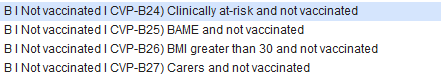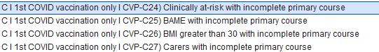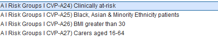 CVP-Q03 Possible frontline health & social care workers is a bit of a challenge due to the historic use of occupation codes to document that the patient has seen a particular type of clinician such as a pharmacist or physiotherapist. Not every frontline worker will have had their current occupation coded on their medical record so it’s never going to be completely accurate. On this basis, occupation has been omitted from priority group 2, but you could manually include patients if they prove their occupation. The report will reveal any occupation code from the patient's record to help identify some of the frontline workers.