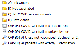The top level folder contains 4 headline searches or reports about vaccination coverage of the organisation's currently registered population.