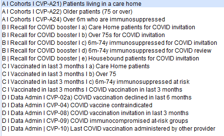 Some Practices may wish to combine eligible patients for both flu and COVID vaccinations. As has been stated, the vast majority of patients eligible for COVID will already be eligible for flu. There is a key difference between Primary Care IT's at-risk cohort for COVID and the at-risk cohort for seasonal influenza; seasonal influenza uses the exact business rules for the Enhanced Service meaning every code will count, while COVID is an interpretation of a table of text. Every effort has been made to utilise the same code groups were possible, and elsewhere we have worked to find the most appropriate code clusters for the conditions listed in the Green Book.
