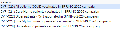 COVID boosters became part of the Seasonal Vaccinations specification from Spring 2026. These searches identify patients over the age of 6 months who would be eligible to receive a COVID vaccination in the Spring 2026 campaign. It forms part of the ...