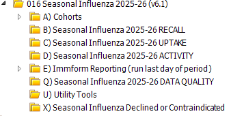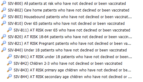 This folder contains separate elements which are linked, and may be used as the final step in converting a list of patients for recall into a mass communication. It includes influenza invitation searches which can be added to recall searches if practices wish to identify only those patients who have not had an invitation or who have had a specific number of invitations. These may also help if you are doing combined flu and covid recalls - see our support article for further details.