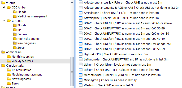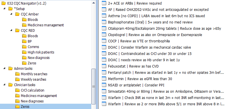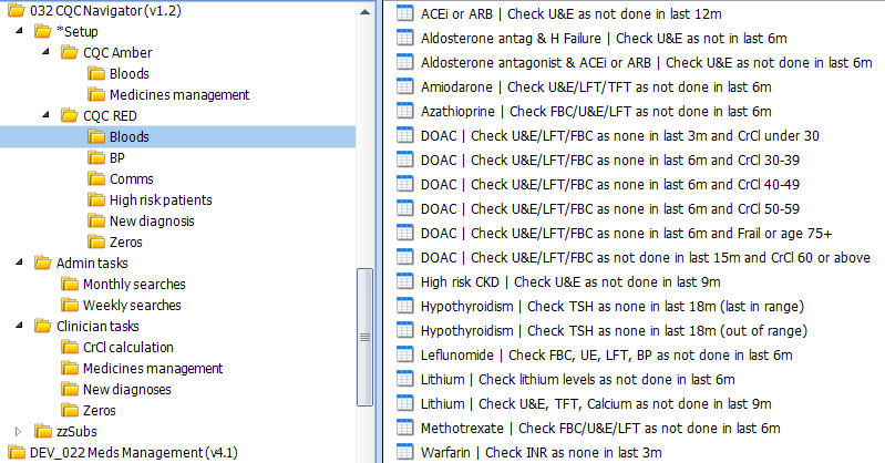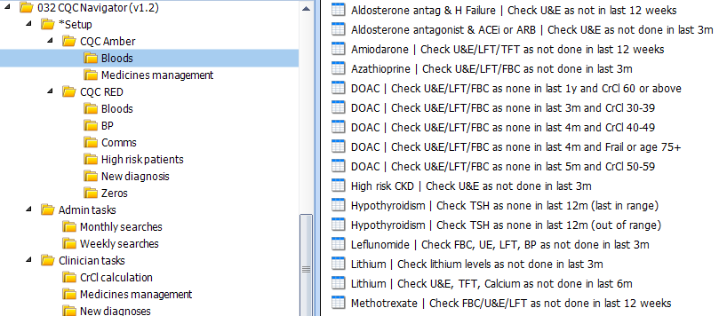 Setup searches are intended to be used once when first starting with the CQC Navigator. It may be that your surgery has a large number of patients appearing in these searches - ideally it should be in the single digits. After Setup is addressed, business-as-usual searches are found in Admin tasks and Clinician tasks folders. Setup is split into "Amber" and "Red".