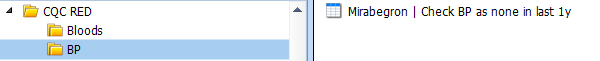 This search will show you every patient who is on Mirabegron and has not had a BP taken in the last 1 year.