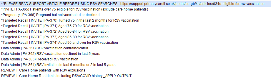The new vaccination programme against Respiratory Syncytial Virus (RSV) goes live in September 2024. In preparation for this new line of work, Primary Care IT has produced this folder of searches to support call and recall activities.