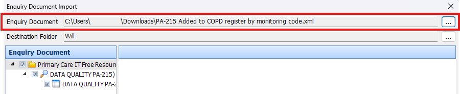 - Enquiry Document Import will appear. Click on the ... button and locate the downloaded file