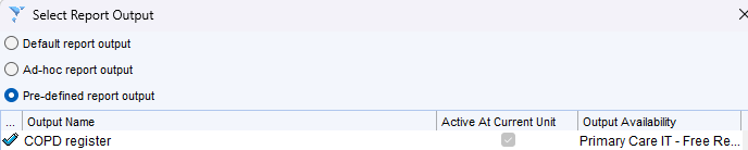 - Click on Pre-defined report output and select the output "COPD register"