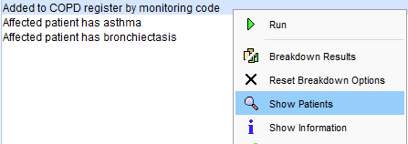 There are 3 reports in the folder: the main search identifies any patient on the COPD register who has at least one of the affected codes without any other COPD diagnosis code. Other reports based on the main report breakdown anybody who appears on the asthma register or who has a diagnosis of bronchiectasis.