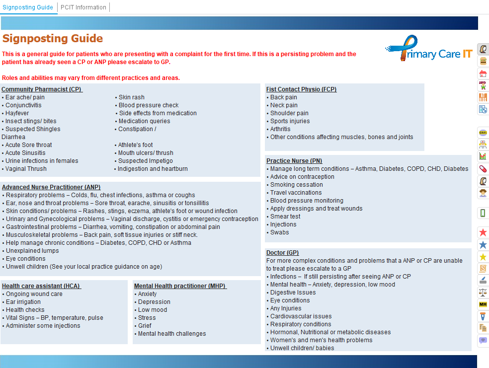 - Guides users on which symptoms or problems can be managed by different roles. (Note: This is a guide only; roles and responsibilities may vary between practices and areas.)