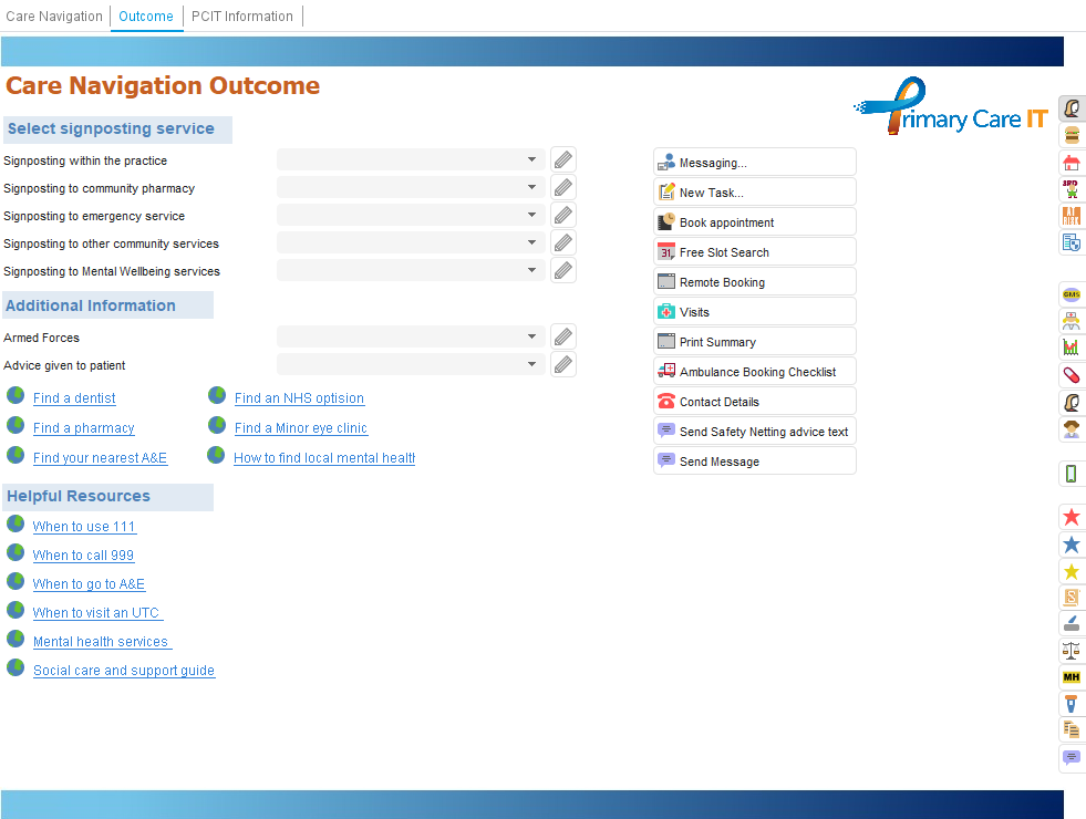 - Allows users to record a variety of signposting options and access quick links for follow-up actions.