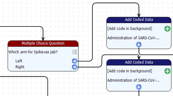 6. Follow the first options across, through the 'which arm' MCQ to the 'Add Coded Data' node. Double click the node to edit it.