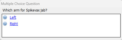 Each Multiple Choice Question (MCQ) repeats the name of the vaccine to reinforce the original selection. If a user realises they have selected the wrong option, they should press Esc and start again from F12.