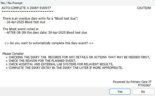Auto-closes diary entries where evidence is found in the record (e.g. test result, coded review).
