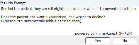 If No is chosen then there is a recommendation to remind the patient that they are eligible and if they decline the COVID vaccination there is an option to code this.