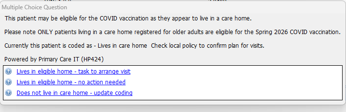 Patients who are under 75 and have a code indicating they may live in a care home will get a different message. This highlights that the care home code alone will not necessarily put them into an eligible cohort and this may need to be confirmed with the person co-ordinating the practice or PCN care home visits. If the patient does not currently live in a care home there is an option to update that coding to ensure they get appropriate recalls in future.