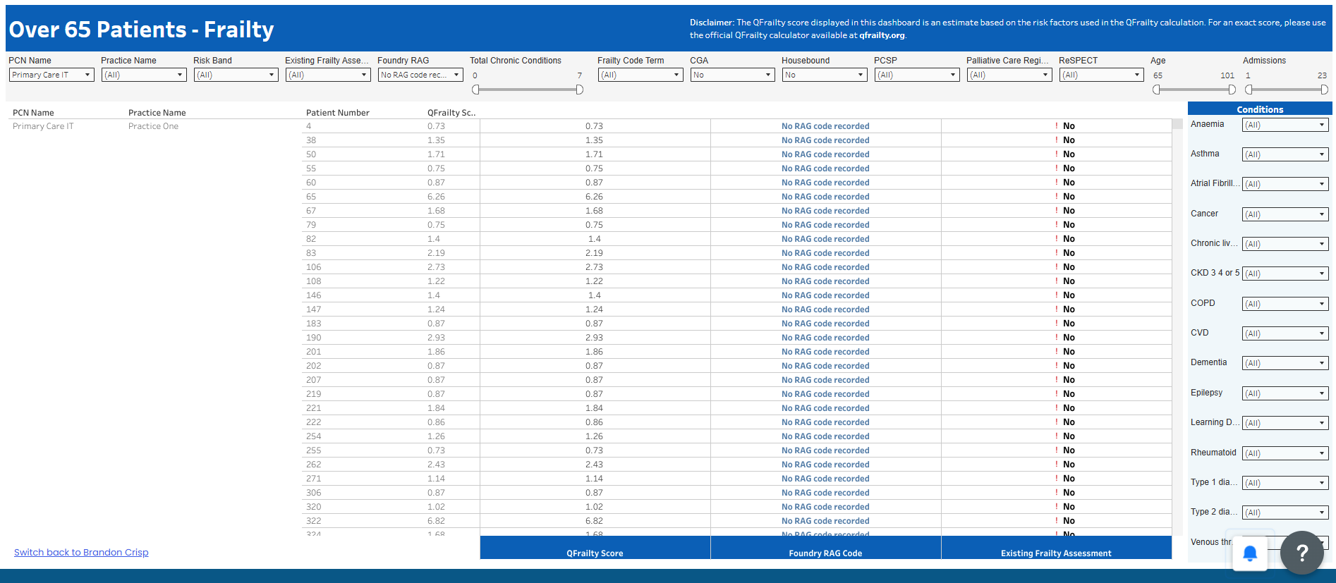This is your high-level snapshot of frailty risk distribution across the selected Primary Care Network (PCN) and practices.