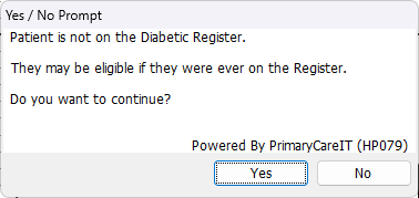 - Advises the user to verify a patient's diagnosis or history if they are not currently on the diabetic register