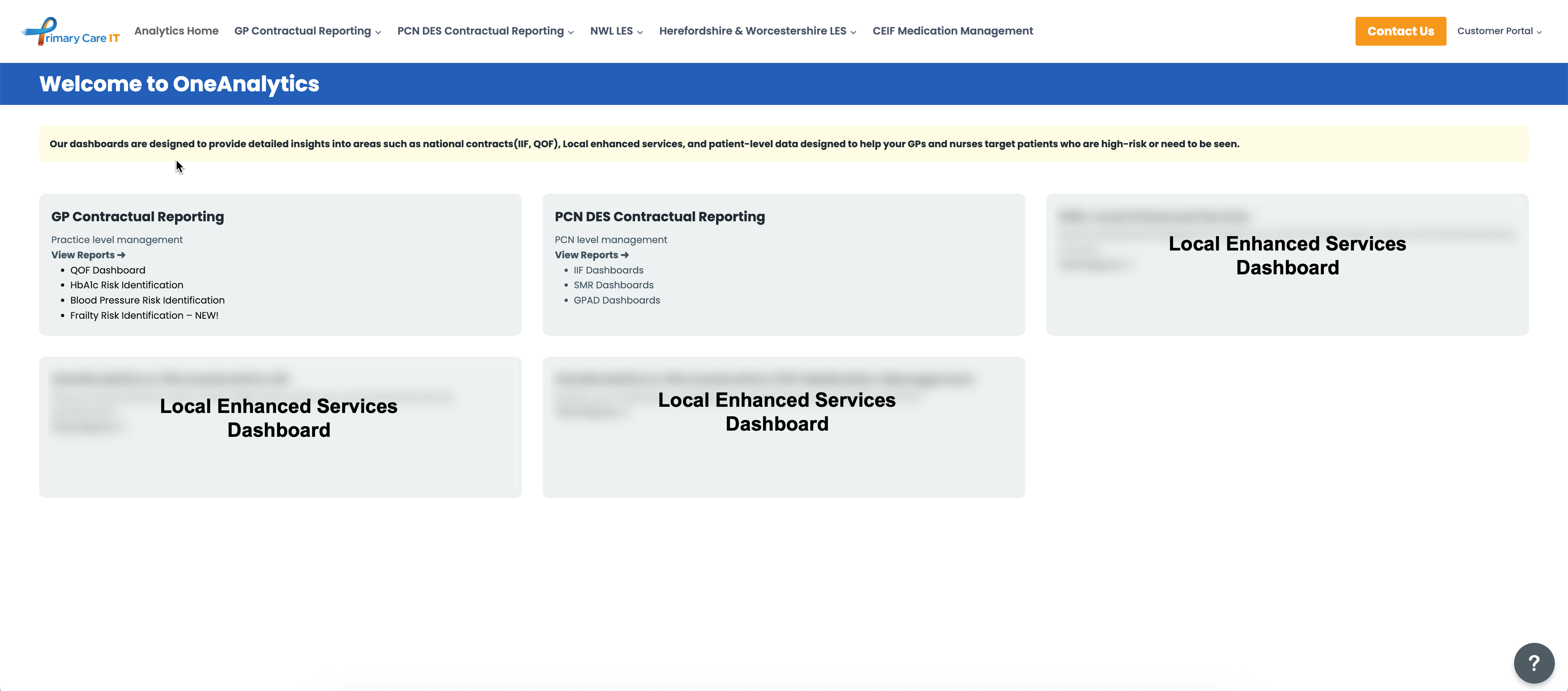 Once logged in to OneAnalytics, depending on your subscription, you will see the following dashboards: