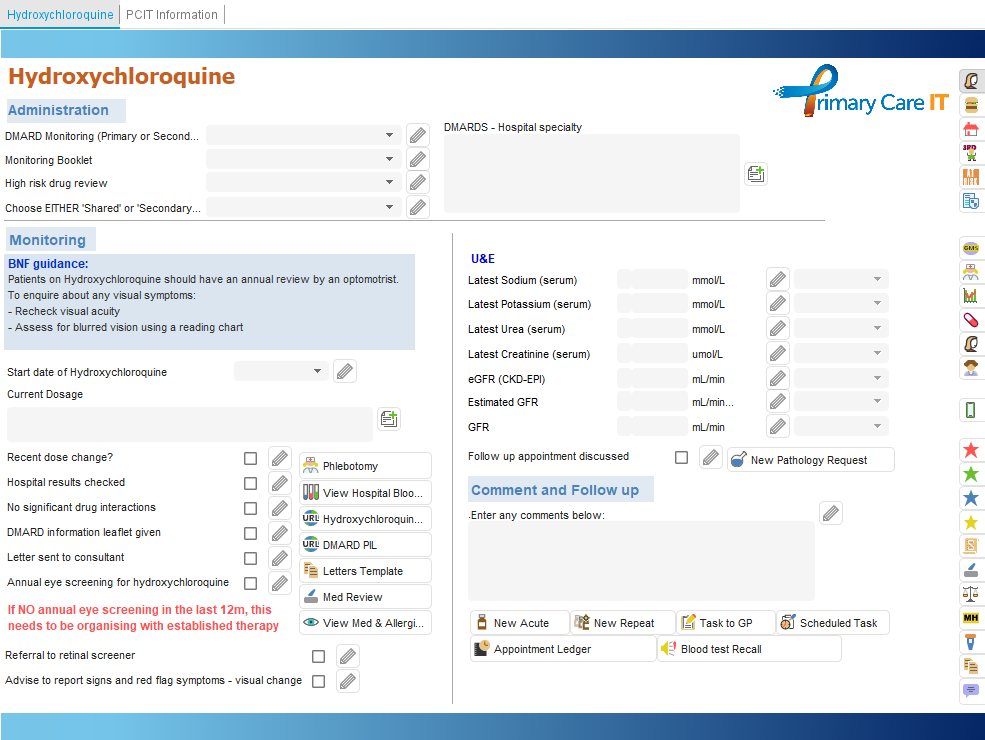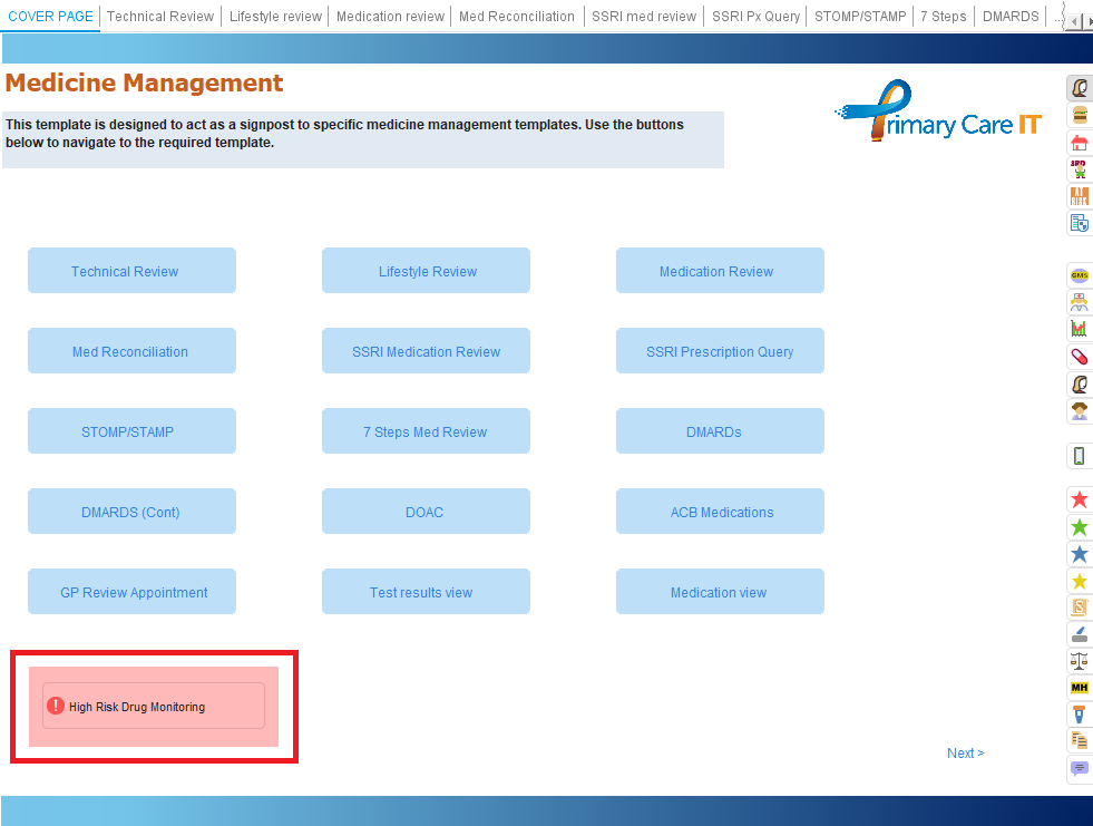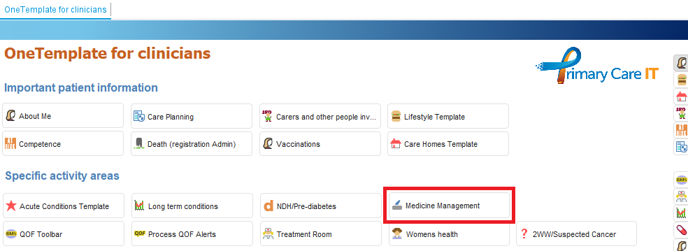 ) which is on the side toolbar on all of the PCIT templates. We have also created a link to the Medicine Management template on our OneTemplate for clinicians and Non-Prescriber OneTemplate.