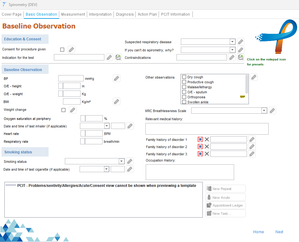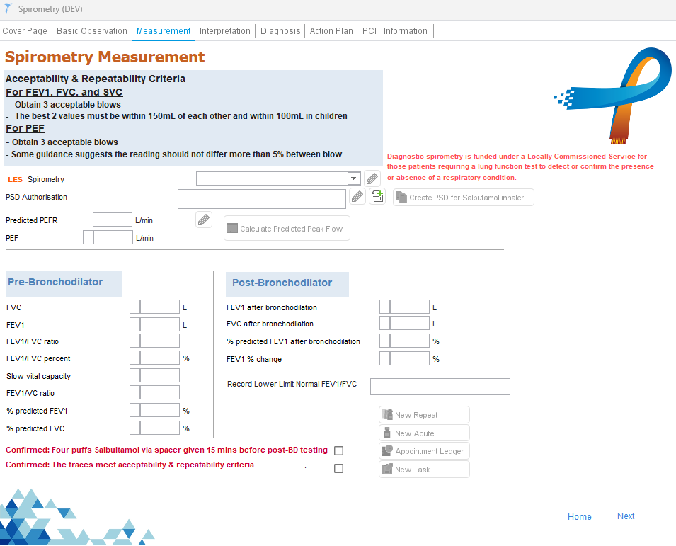 The Spirometry Template guides clinicians through each stage of the spirometry assessment, providing clinical prompts, calculation support, and structured fields that ensure consistency and compliance with ARTP/NICE-aligned practice.