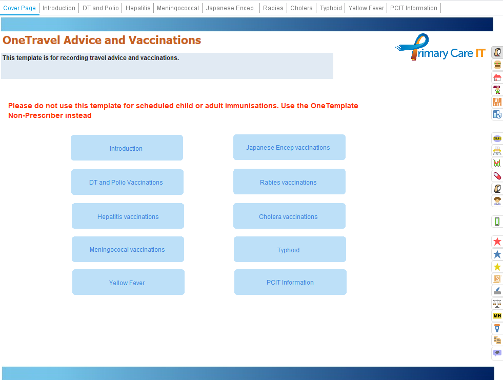 Primary Care IT is pleased to announce that it is releasing the OneTravel template. This template can be used to record travel vaccines within Primary Care with great ease. This has pre-formatted text to be able to quickly record standard advice for travel. The template can be found in both PCIT OneTemplate Clinician and Non-Prescriber.