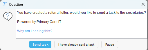 - Automatically prompts the user to confirm that a task has been sent to the secretaries to send the referral.