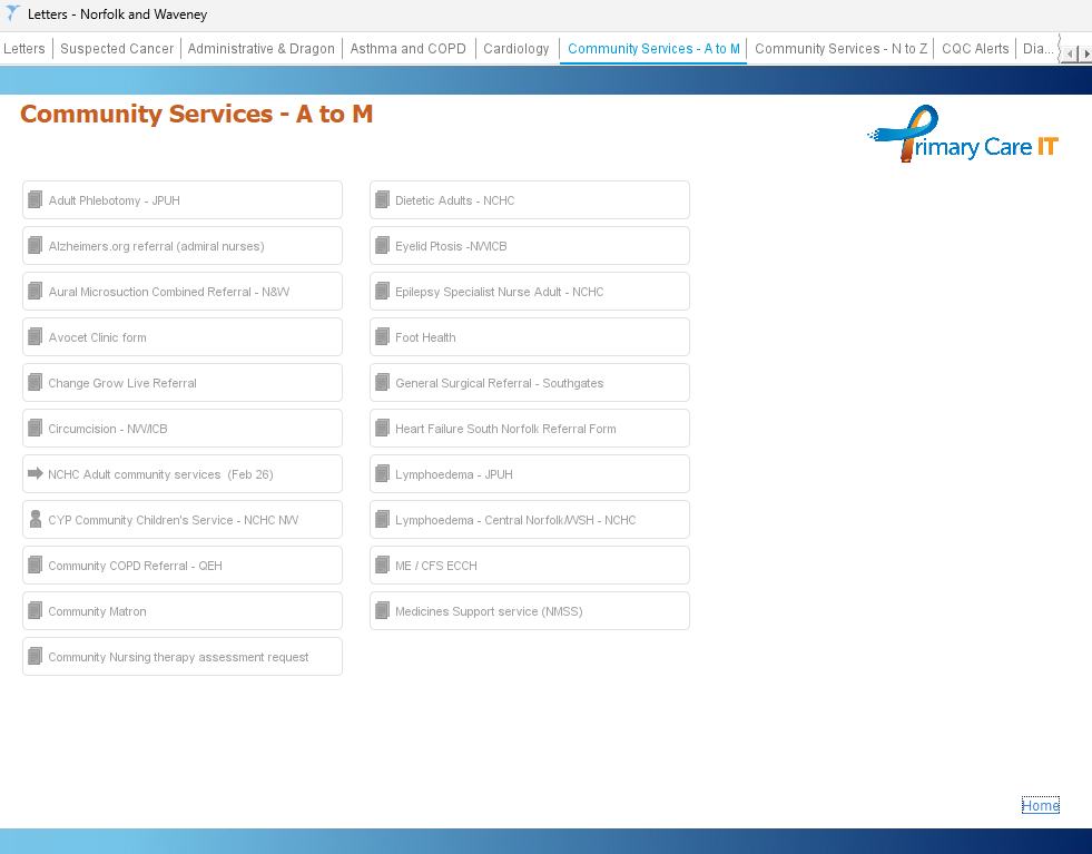 Community Services (A to M) | Community Services (A–M) · Adult Phlebotomy – JPUH · Adult Community Therapy Service - NCHC · Alzheimers.org referral (admiral nurses) · Aural Microsuction Combined Referral - N&W · Avocet Clinic Form · Change Grow Live Referral · Circumcision - NWCB · CYP Community Children's Service - NCHC NW · Community COPD Referral - QEH · Community Matron · Community Nursing therapy Assessment Request · Dietetic Adult NCHC · Eyellid Ptosis - NWCB · Epilepsy Specialist Nurse Adult - NCHC · Epilepsy Specialist Nurse Adult - NCHC · Foot Health · General Surgical Referral – Southgates · Heart Failure South Norfolk Referral Form · Lymphoedema – JPUH · Lymphoedema – Central Norfolk/WSH – NCHC · ME / CFS ECCH · Medicines Support service (NMSS) |