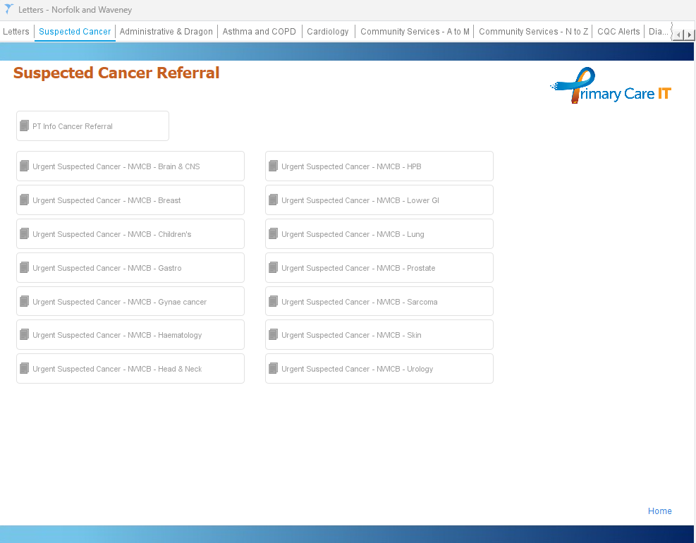 Suspected Cancer | · Urgent Suspected Cancer Brain & CNS · Urgent Suspected Cancer Breast · Urgent Suspected Cancer Children’s · Urgent Suspected Cancer Gastro · Urgent Suspected Cancer Gynae cancer · Urgent Suspected Cancer Haematology · Urgent Suspected Cancer Head & Neck · Urgent Suspected Cancer HPB · Urgent Suspected Cancer Lower GI · Urgent Suspected Cancer Lung · Urgent Suspected Cancer Prostate · Urgent Suspected Cancer Sarcoma · Urgent Suspected Cancer Skin · Urgent Suspected Cancer Urology |